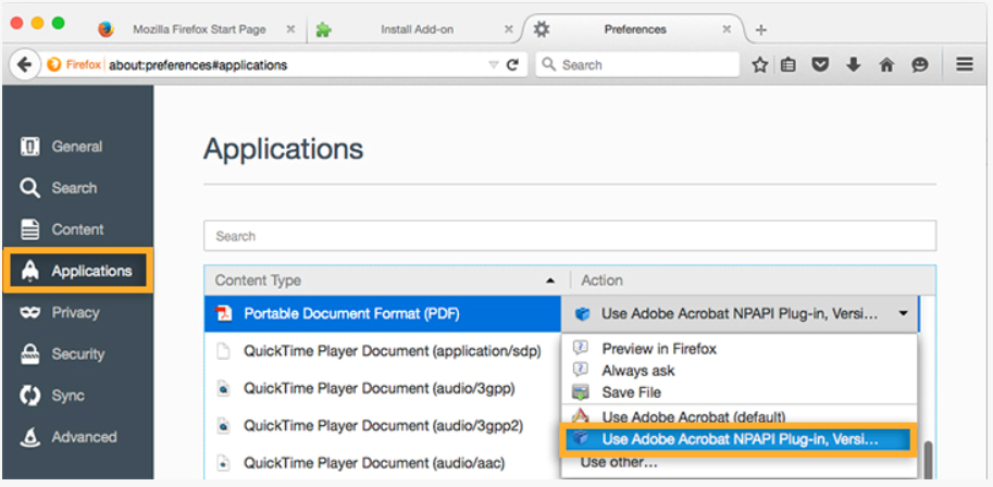 Haga clic en la columna de acción, junto a Portable Document Format (PDF) y, a continuación, seleccione Usar complemento Adobe Acrobat NPAPI.