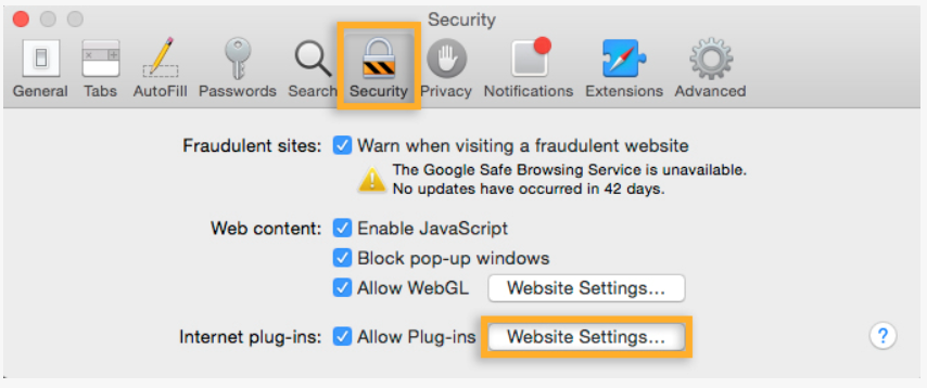 2. En la ventana Preferencias, haga clic en Seguridad y seleccione Gestionar ajustes de sitios web junto a Módulos de Internet.
